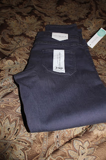 I changed up my style a bit with this shipment and asked for a more romantic look. They sent this navy and red blouse by Collective Concepts to wear with the Purple jeans, a grey cardigan and necklace.